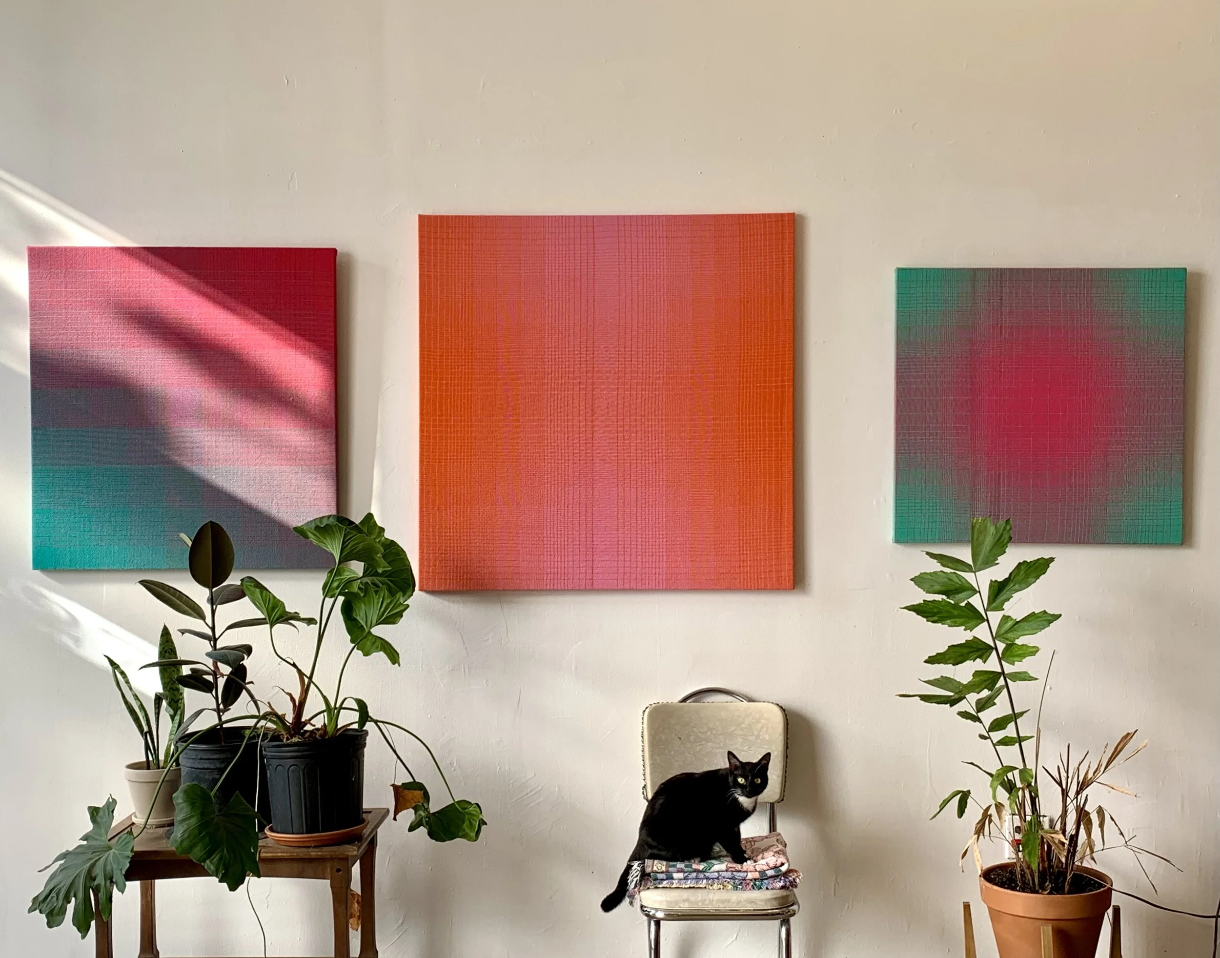 Harper Newell is a Fiber Artist based in Kansas City, Missouri. Her art practice primarily consists of what she calls color field weavings which explore color interactions via individual threads that when woven together create soft, aura like gradients. The meditative quality of the work both in its process and outcome invite the viewer to look within while subtle shifts of bright colors invite them to move left, right, forward, and back in order to better comprehend the implied movement within the work. Newell’s work references the Light and Space movement using colors and titles that reflect on her upbringing in the DIY arts and culture scene in Omaha Nebraska. Newell received a BFA in Fiber in 2020 from the Kansas City Art Institute.